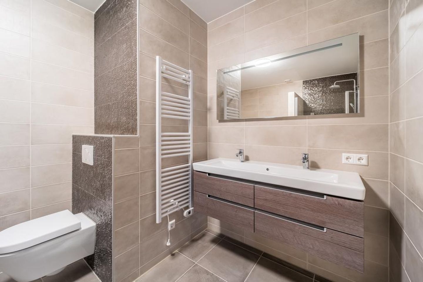 De high-end badkamer is voorzien van een ligbad, inloopdouche, dubbele wastafel met meubel en een tweede toilet.