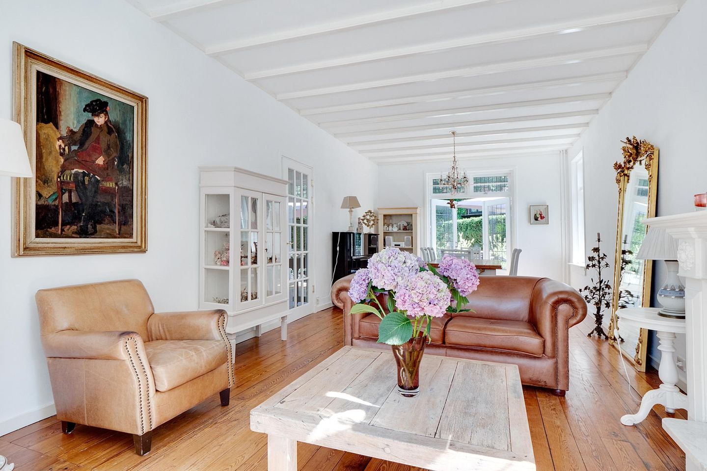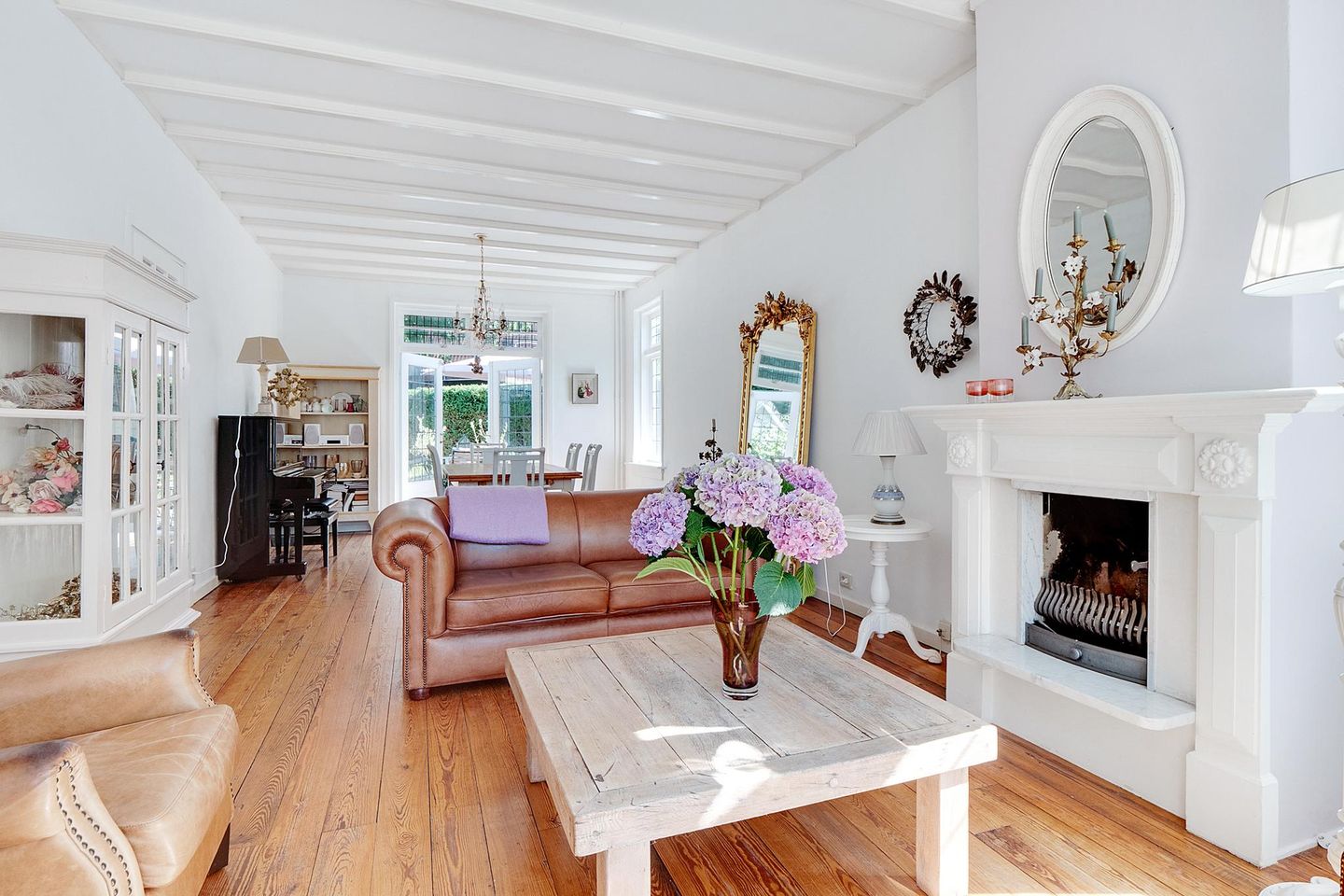 Begane grond: karakteristieke entree, royale hal met toilet en meterkast, toegang tot de lichte living met open haard. De woonkamer is voorzien van houten vloeren en heeft een sfeervolle uitstraling dankzij de vele karakteristieke elementen. Openslaande deuren aan de achterzijde verlenen toegang tot de bijzonder fraaie, verzorgde tuin.