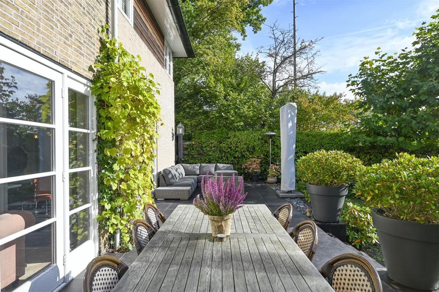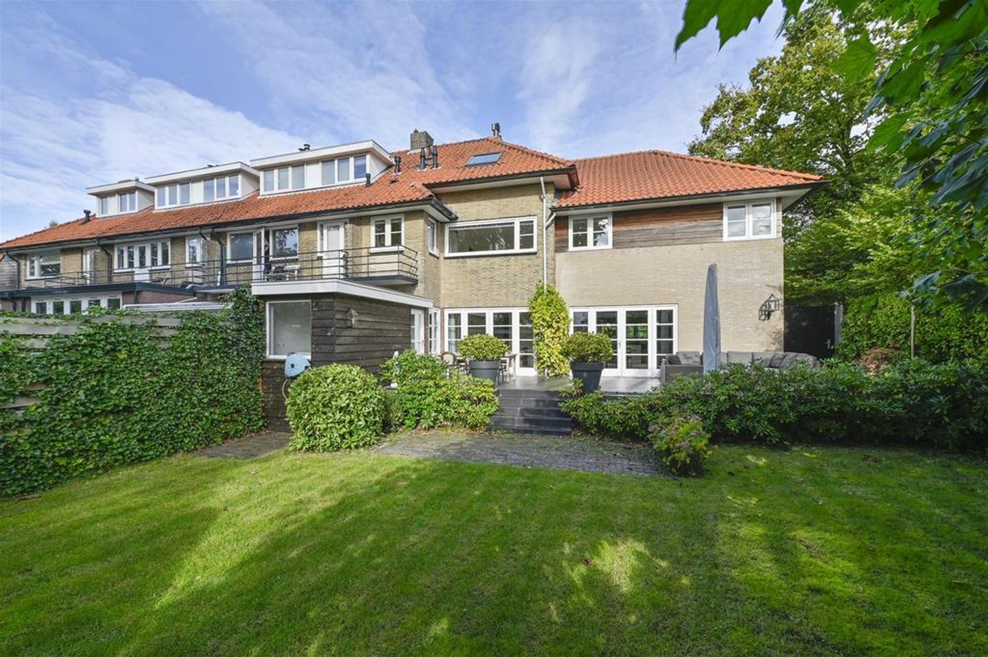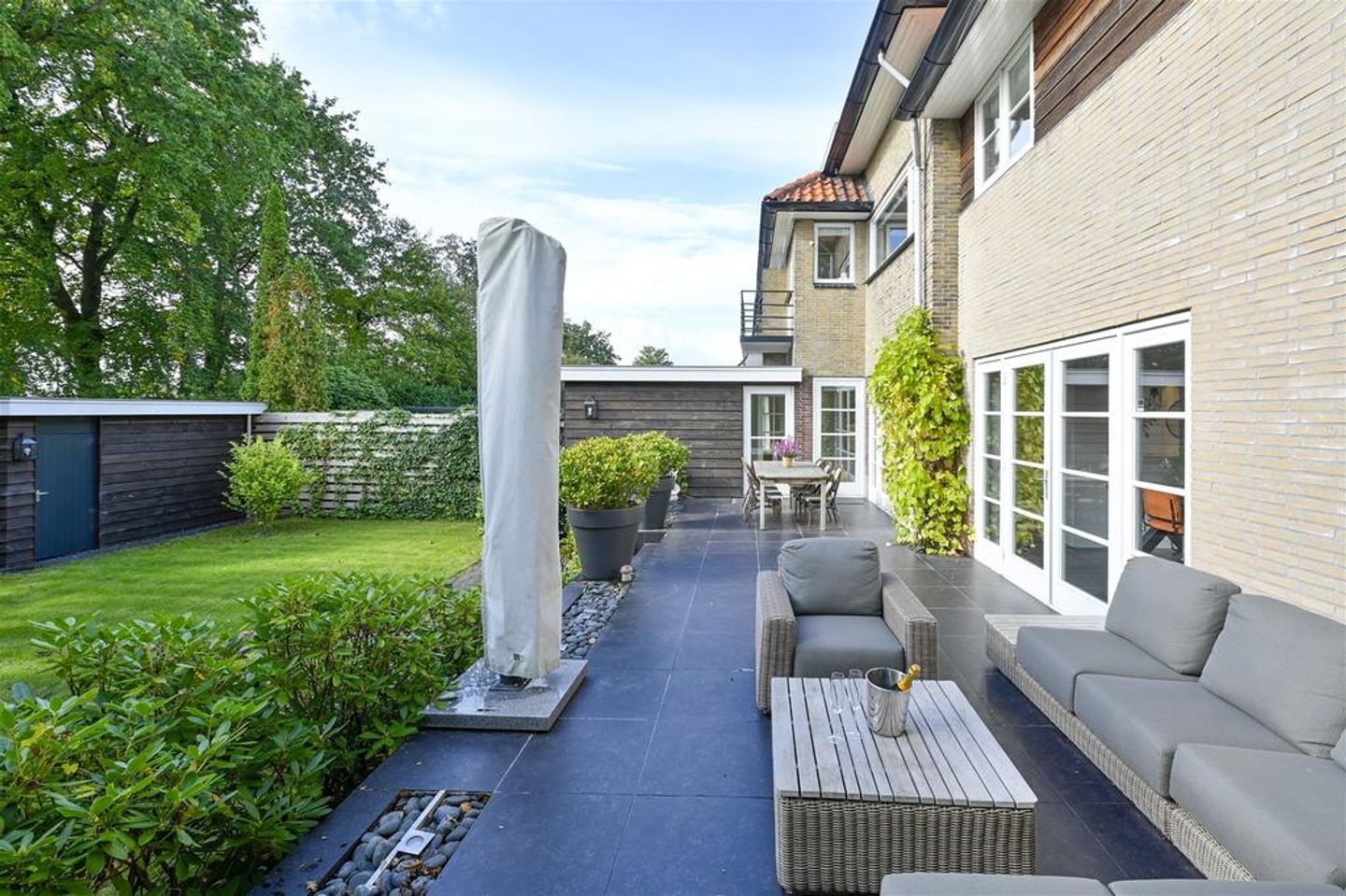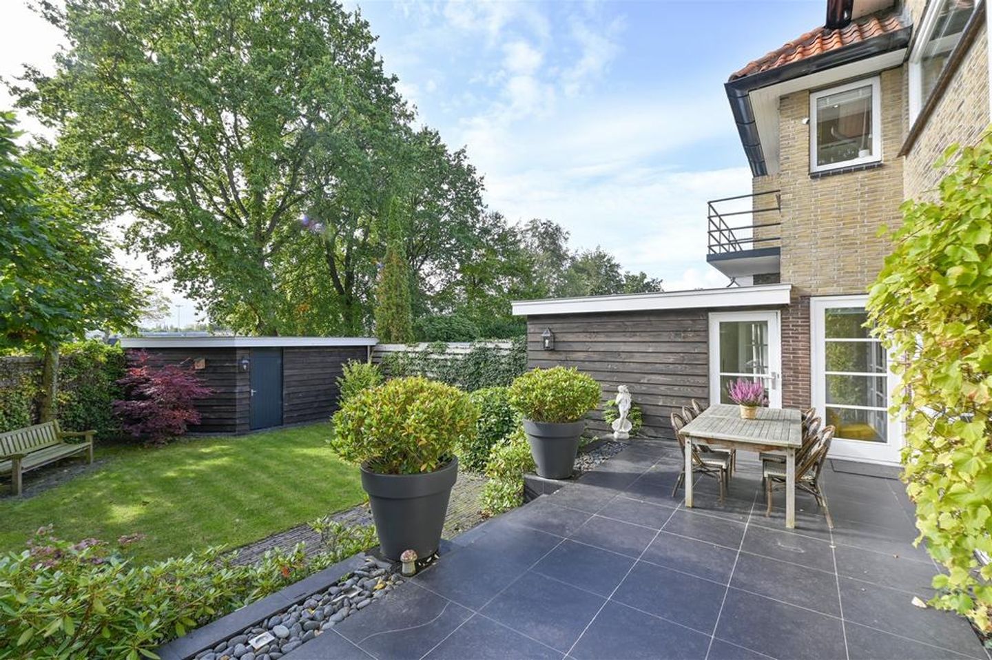 Een ruim perceel met fraai aangelegde voortuin, meerdere parkeerplaatsen, een afsluitbaar achterom, een besloten achtertuin met een ruim zonneterras op het zuiden en een voormalige garage als grote schuur.