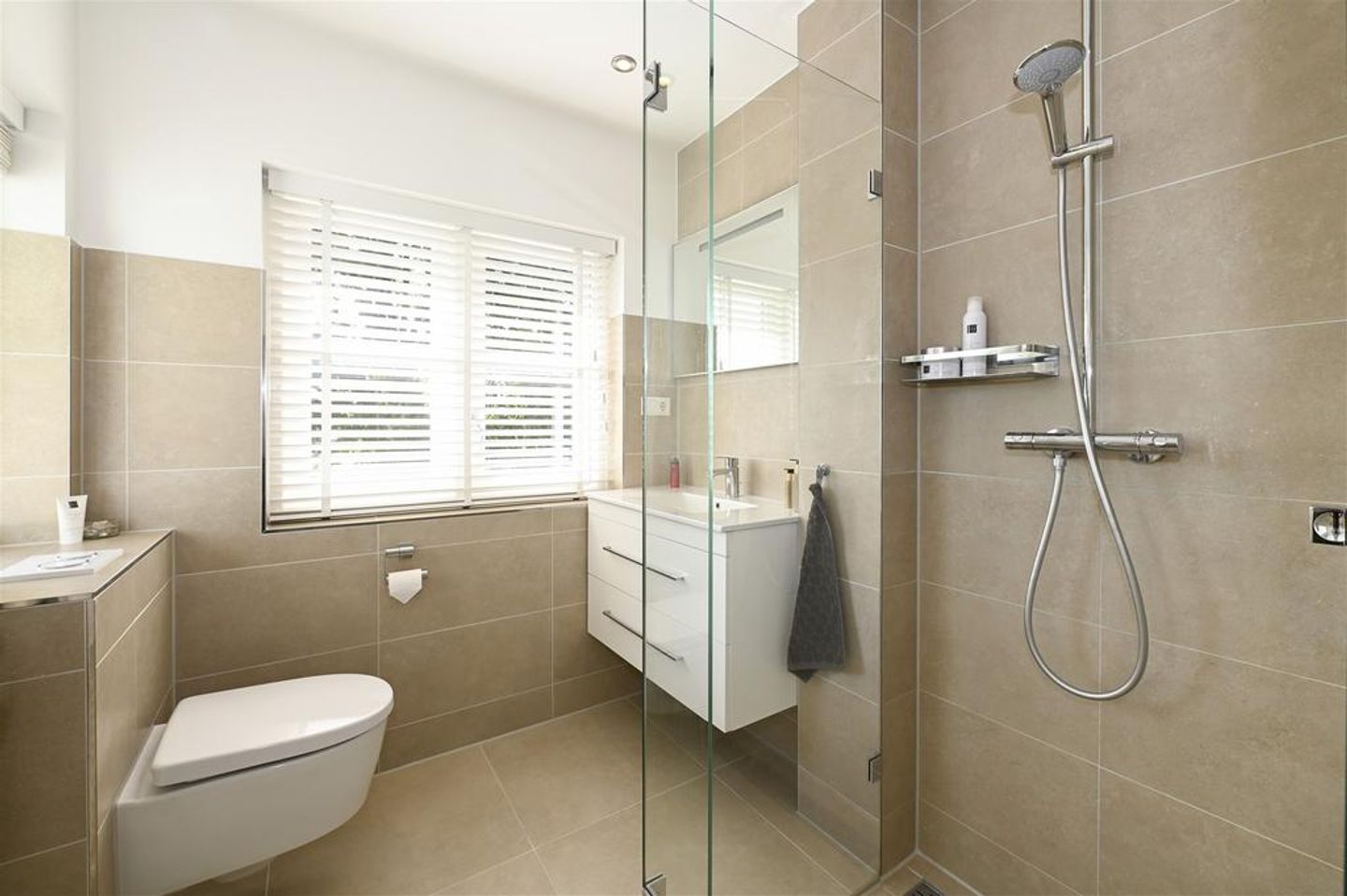 Overloop, 2 slaapkamers aan de voorzijde van het huis, een badkamer met douche, toilet en wastafel. De masterbedroom bevindt zich aan de achterzijde van het huis en heeft 2 inbouwkasten, een walk-in closet met veel kastruimte en een eigen badkamer met speelse schuifdeur, douche, toilet en wastafel.
